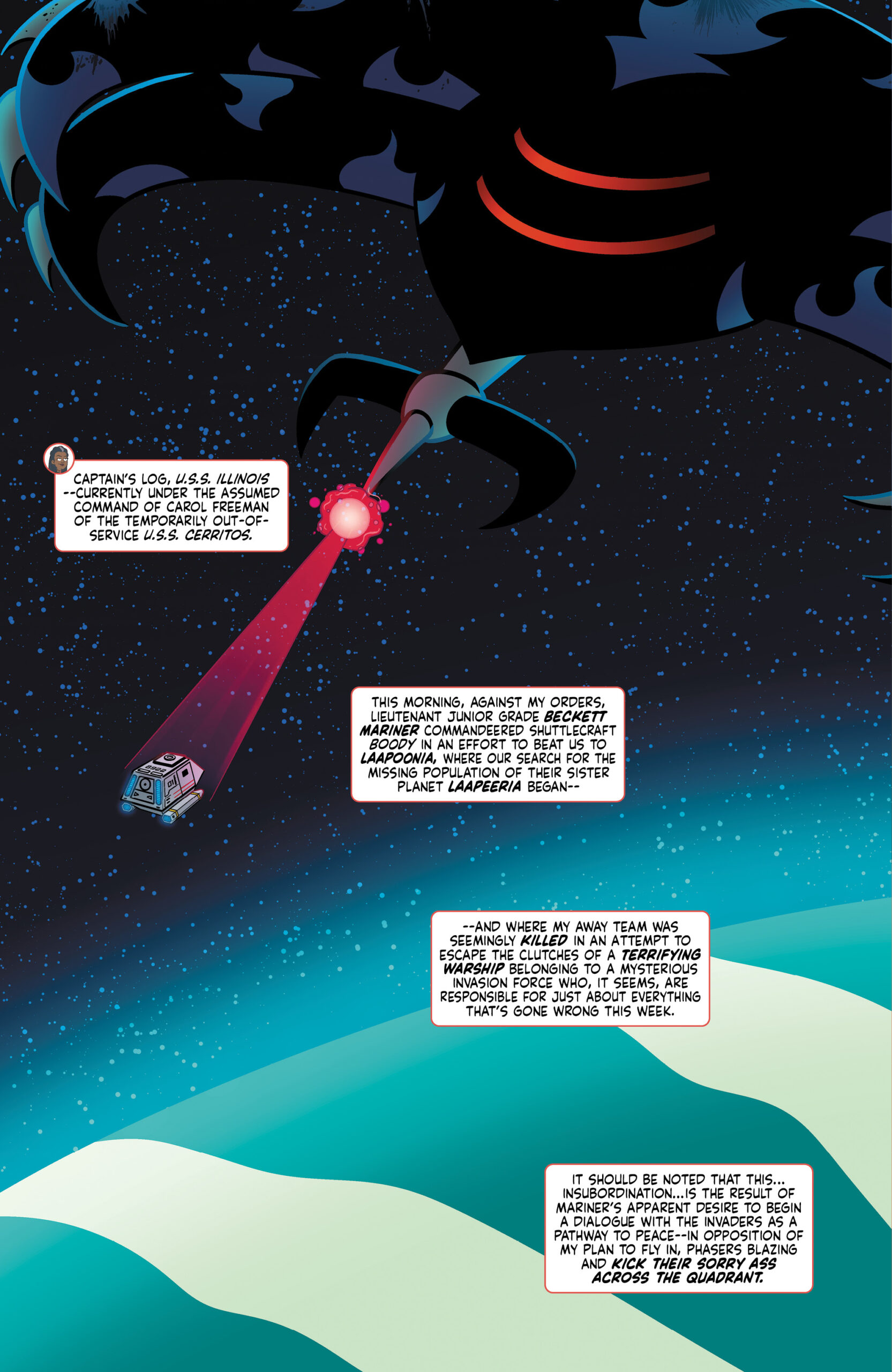 The Enterprise has joined the tumultuous space battle between Captain Freeman and her crew against their dangerous alien assailants. Starfleet might not know who these invaders are, but they’re certain they have something to do with the missing population of Laapeeria…